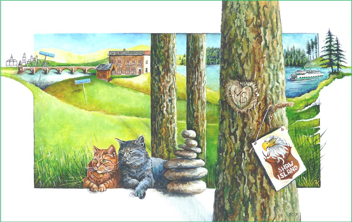 Vele reizen met motor/auto = Reiskoffer/landenstickers. Woonplaats Roden (wapenschild) later Jailhouse City Veenhuizen, met roze tante Hennie prunus. Liefhebber motoren/sport: eerste Honda. Logo motorclub / raceteam, TT-logo en Hyundia op de F1 Max verstappen auto nr33. Karpathos ( grieks/appartement).